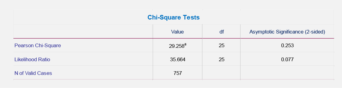 İki nominal dəyişənin tezlik paylanmasının bir-birindən fərqini test etmək üçün Chi-square Proporsiyaların Homogenliyi Testindən (chi square test of homogeneity of proportions) istifadə olunur. Təsvir 2- də bu testin IBM SPSS proqramından əldə edilmiş nəticələri göstərilmişdir.